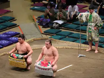 三段目取組の途中で、今場所前相撲を取った新弟子2人の新序出世披露が行われた。
