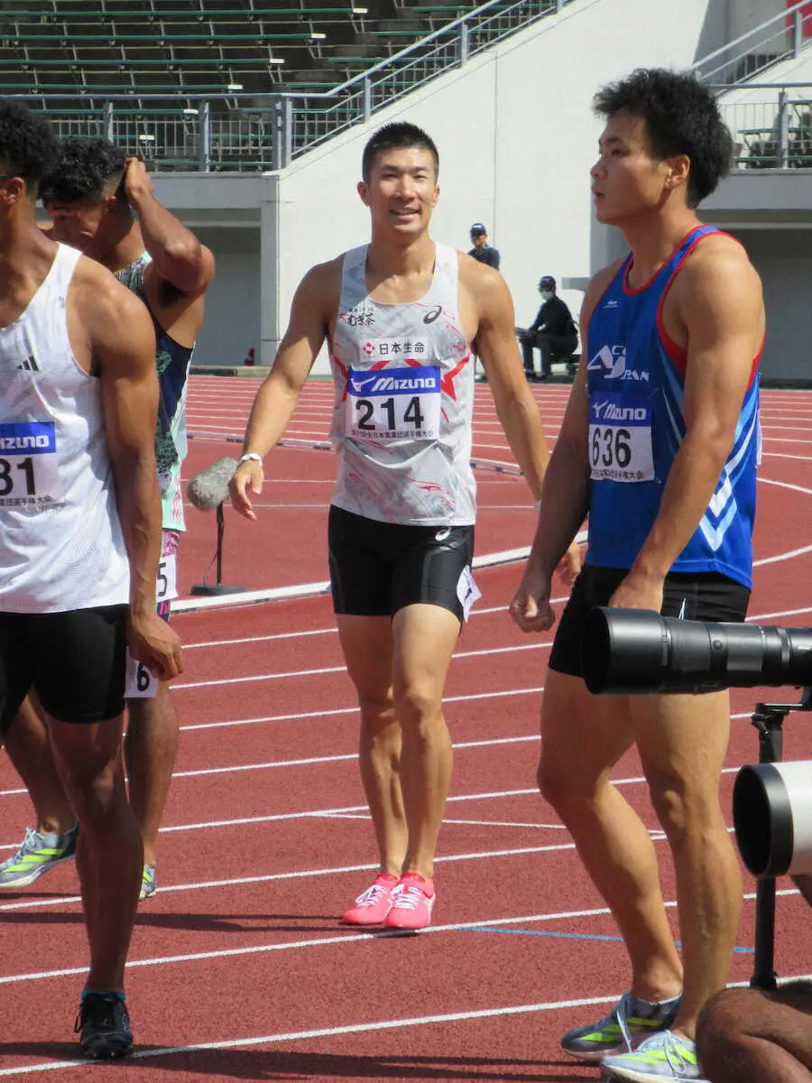 予選を走り終えて笑顔を見せる桐生(中央)