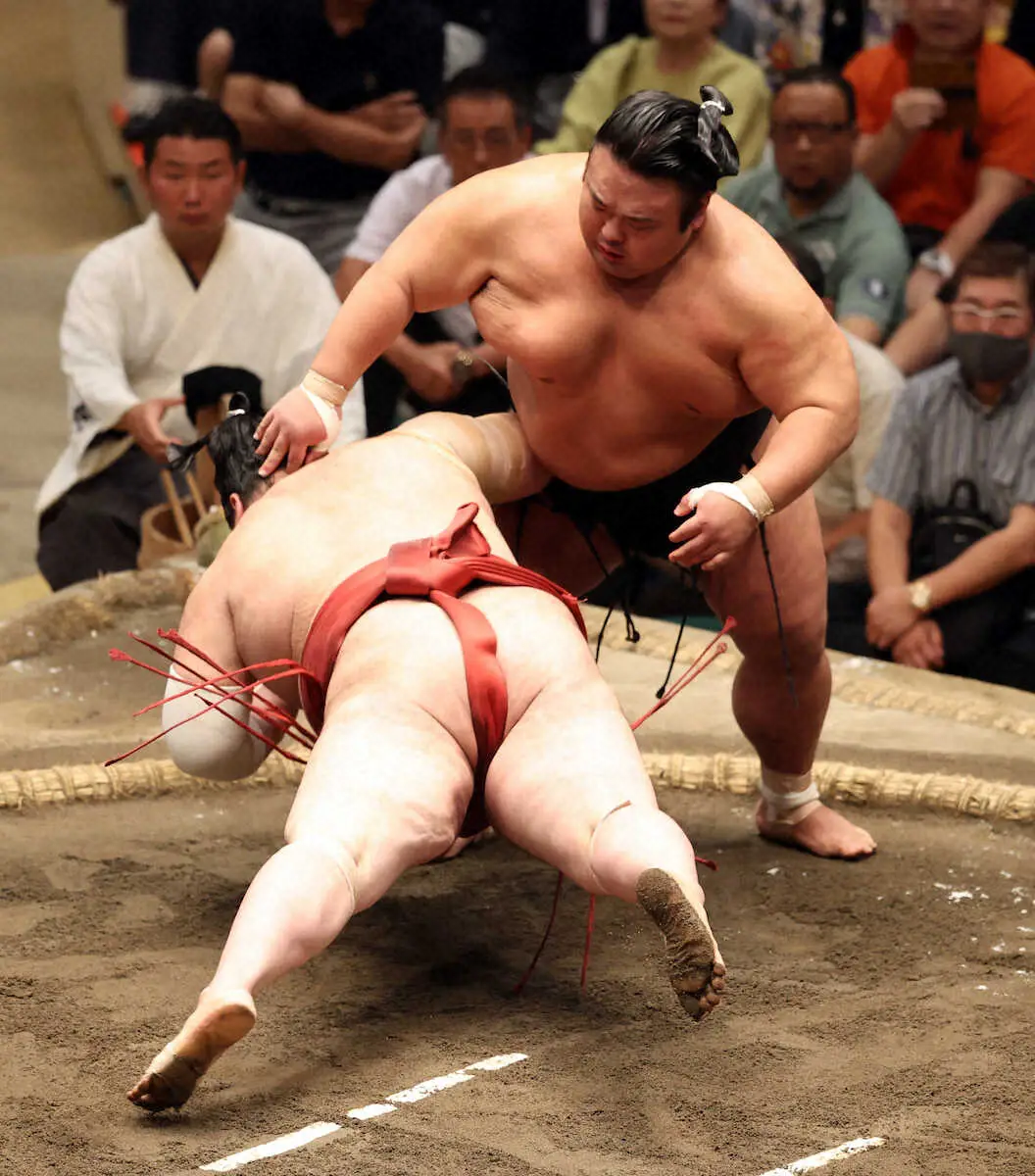 大栄翔戦は激しくぶつかった。突っ張りを受け止めること計14発。立ち合いの位置から一歩として引かず反撃開始。最後は左はず押しで突き上げて送り出した。