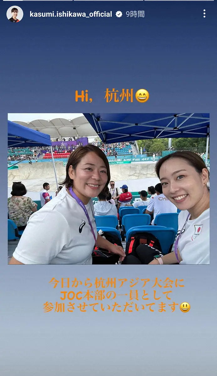 石川さんは「Hi、杭州 今日から杭州アジア大会にJOC本部の一員として参加させていただいてます」とつづり、谷本歩実さんとともに笑顔の写真を投稿。