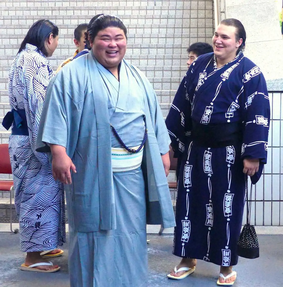 相撲教習所の卒業式を前に笑顔を見せる伯桜鵬(左)と、入所式に出席する安青錦(撮影・前川 晋作)