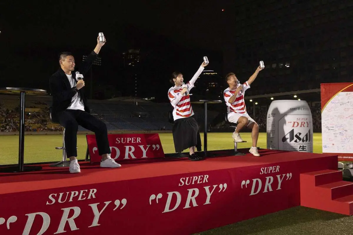 ラグビーW杯フランス大会のアルゼンチン戦のPV(パブリックビューイング)は、“聖地”秩父宮ラグビー場でも行われた(特別協賛:アサヒスーパードライ)。元ラグビー日本代表の五郎丸歩氏(37)、タレントの高山一実(29)と勝俣州和(58)が、桜のジャージを着用した約1万人のファンとともに、フランスの地で戦う戦士たちに声援を送り続けた。
