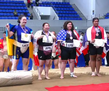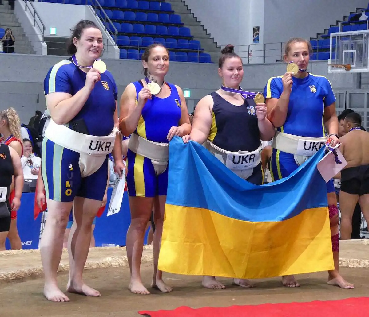 女子重量級で優勝したウクライナのベレゾフスカ・イワンナ(左端)。左から2人目は準優勝の今日和(撮影・前川 晋作) Photo by スポニチ 【世界相撲】ウクライナ勢が大活躍!個人7階級と女子団体で金メダル 獅司… ギャラリーで見る この記事のフォト 2023年10月09日の画像一覧 もっと見る 2023年10月09日の画像をもっと見る