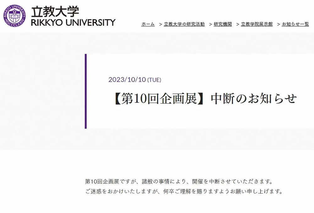 創立150周年の節目を迎えた同大は、今月7日から「立教と箱根駅伝」企画展が開催されていた。同大は「本企画展では、立教チームが、戦前・戦後、常連校として箱根駅伝に出場してきた歴史と、立教箱根駅伝2024事業による、55年ぶりとなる本選出場への軌跡を、様々な資料から跡づけます。どうぞ、お楽しみください」と呼びかけていたが、今月10日に「第10回企画展ですが、諸般の事情により、開催を中断させていただきます」と、わずか3日での企画の中断を発表。「ご迷惑をおかけいたしますが、何卒ご理解を賜りますようお願い申し上げます」と理解を求めた。