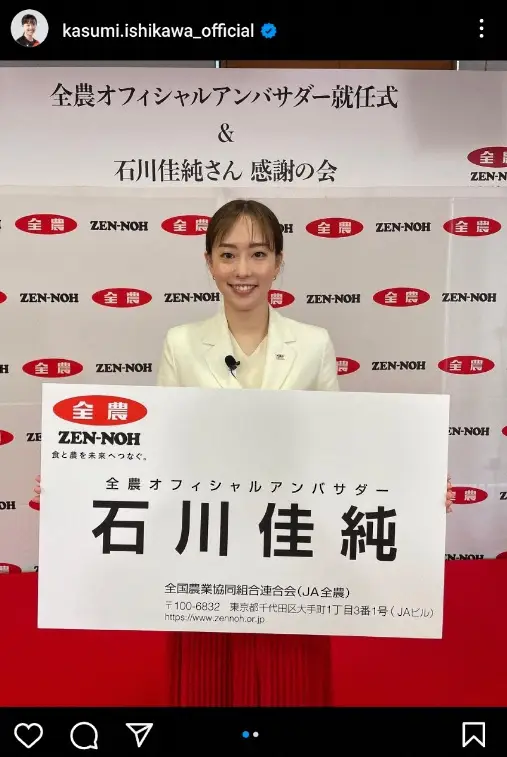 「今日は全農オフィシャルアンバサダーの就任式でした。現役引退後もご一緒させて頂く事が出来てとても嬉しいです。ニッポンの美味しい農畜産物の魅力をPRしていきたいです!」とつづり、10日に都内で行われた「全農オフィシャルアンバサダー就任式」で、白いジャケット&赤のスカートの全農カラー姿で、アンバサダーの特大名刺を持っている写真をアップ。