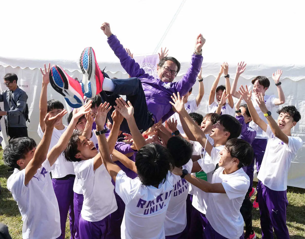 歓喜の瞬間を迎えると、感情を一気に爆発させた。立大が6位で再び箱根路へ。上野前監督に代わり急きょ指揮を執った原田昭夫総監督は「ご迷惑をかけ、申し訳ないです。学生たちが、はしゃぐのはどうか許してやってください」と号泣。1時間2分15秒でチームトップ14位の関口絢太(4年)は「騒動があっても、選手たちは突破したい強い思いがあった」と胸を張った。