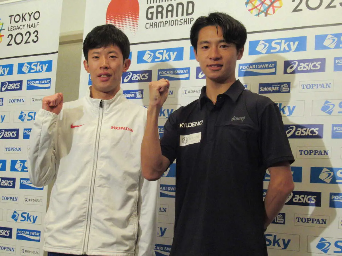 レースから一夜明けて写真撮影に応じる小山(左)と赤崎