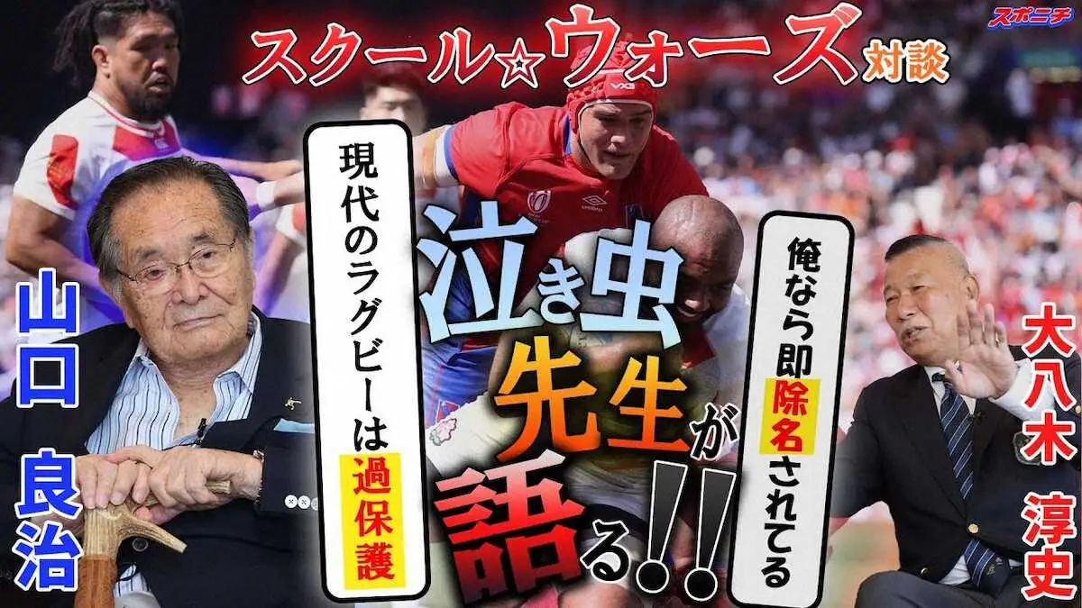 元ラグビー日本代表の大八木淳史氏(62)がゲストを招いてトークする「レジェンド対談」。第一弾は大八木氏の恩師で、日本代表フランカーとしても活躍した元伏見工業高校監督の山口良治氏(80)です。あの伝説のテレビドラマ「スクール☆ウォーズ」の主人公、滝沢賢治のモデルにもなった“泣き虫先生”が、教え子の“暴れん坊”と語り合った。