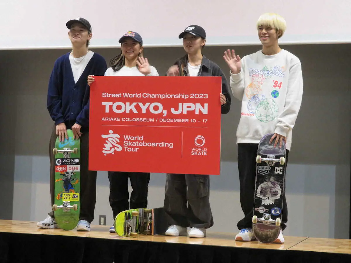 日本初開催となるスケートボード・ストリートの世界選手権(12月13~17日、東京・有明コロシアム)の記者発表会見が都内で行われ、東京五輪男子代表の白井空良(ムラサキスポーツ)らが出席。