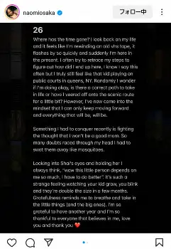 7月に第1子となる長女を出産した女子テニスの元世界ランキング1位の大坂なおみ(フリー)が23日までに自身のインスタグラムを更新。16日に26歳の誕生日を迎え、思いをつづった。