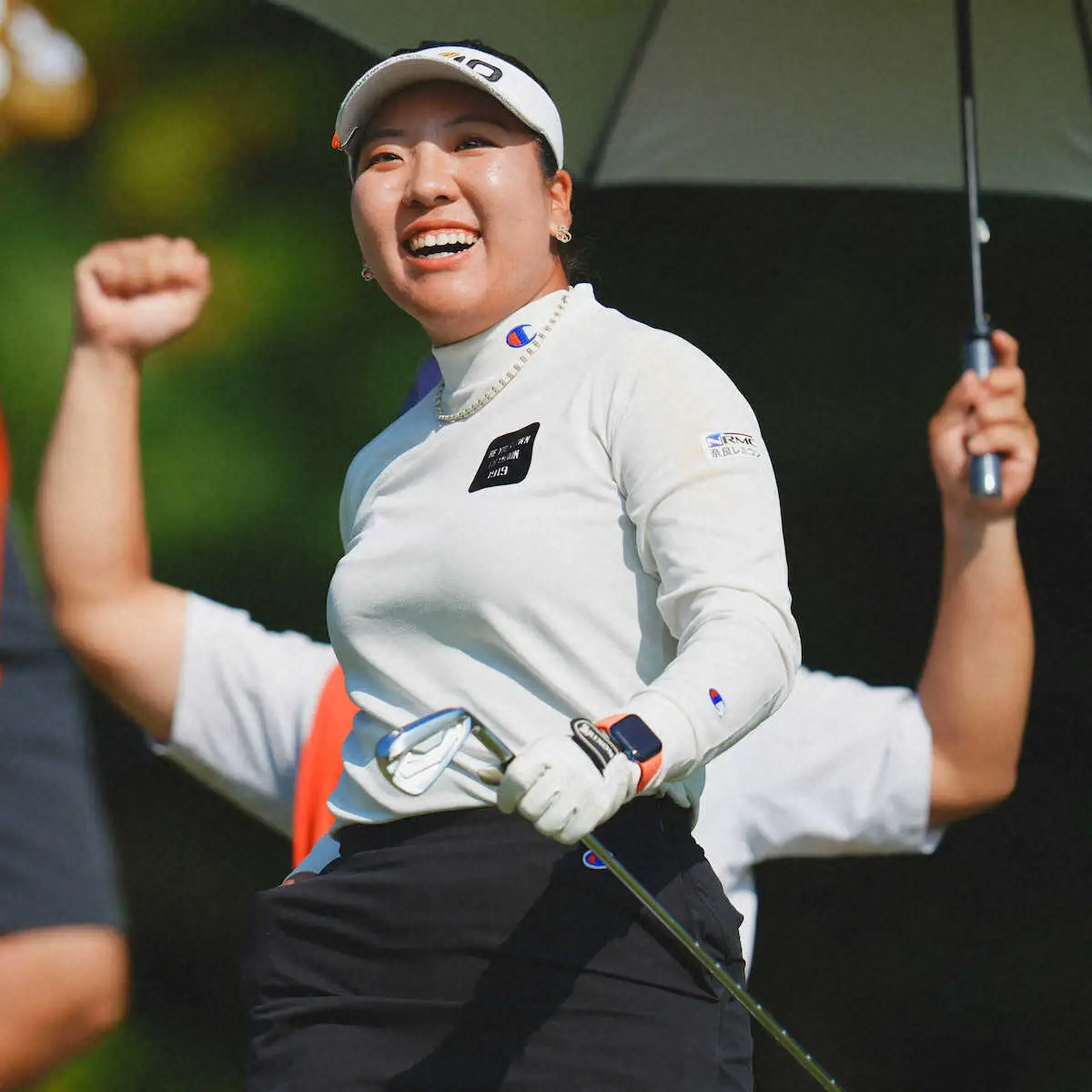 <三菱電機レディース・2日目>8番、ホールインワンを達成し笑顔を見せる仁井優花(撮影・西尾 大助