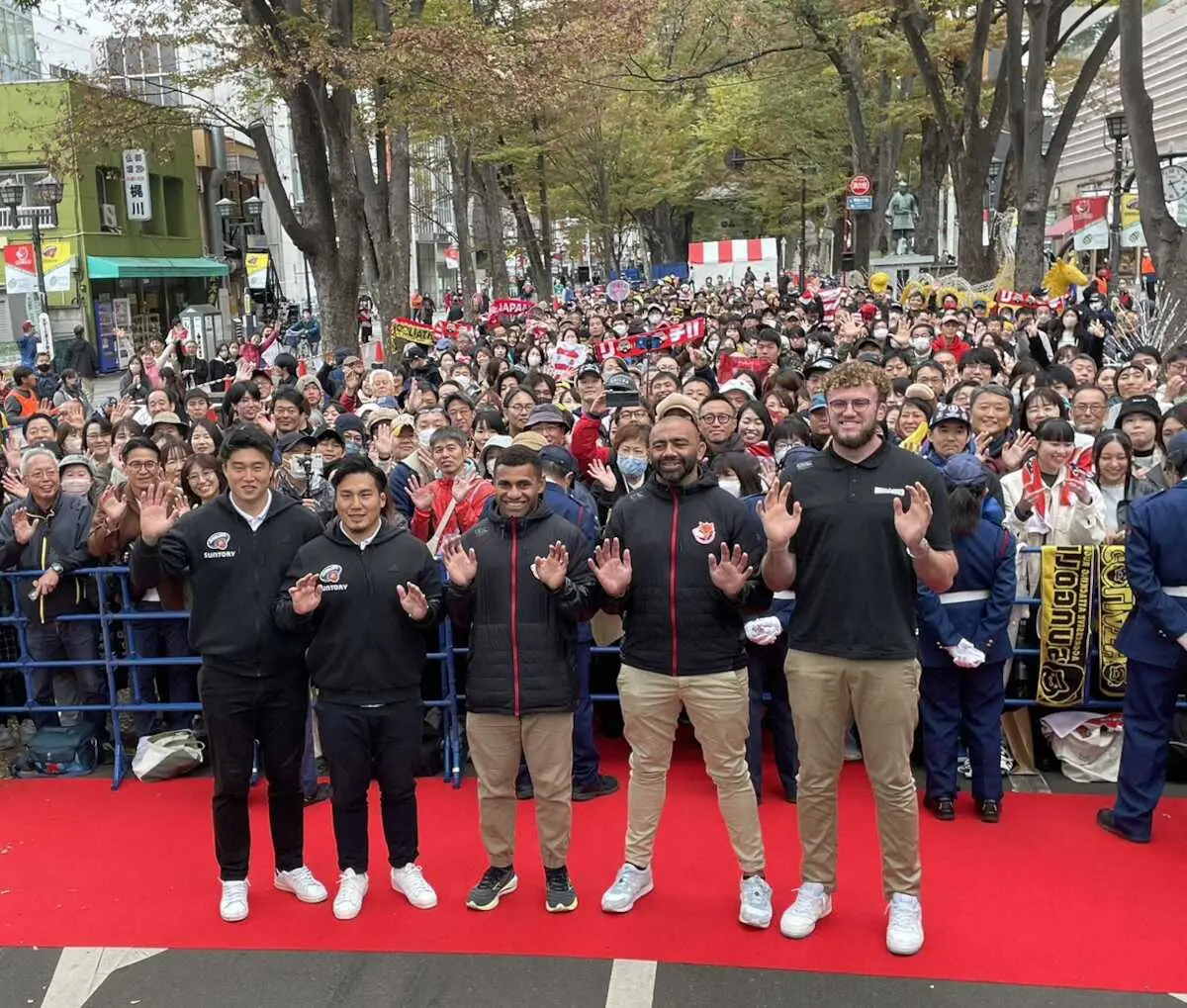 BL東京からはフランカーのリーチ・マイケル、ロックのワーナー・ディアンズ、WTBジョネ・ナイカブラ、東京SGからはフッカー堀越康介とフランカー下川甲嗣が参加。ファン約5000人を前にしたパレードでは写真撮影やサインで約40分間交流した。