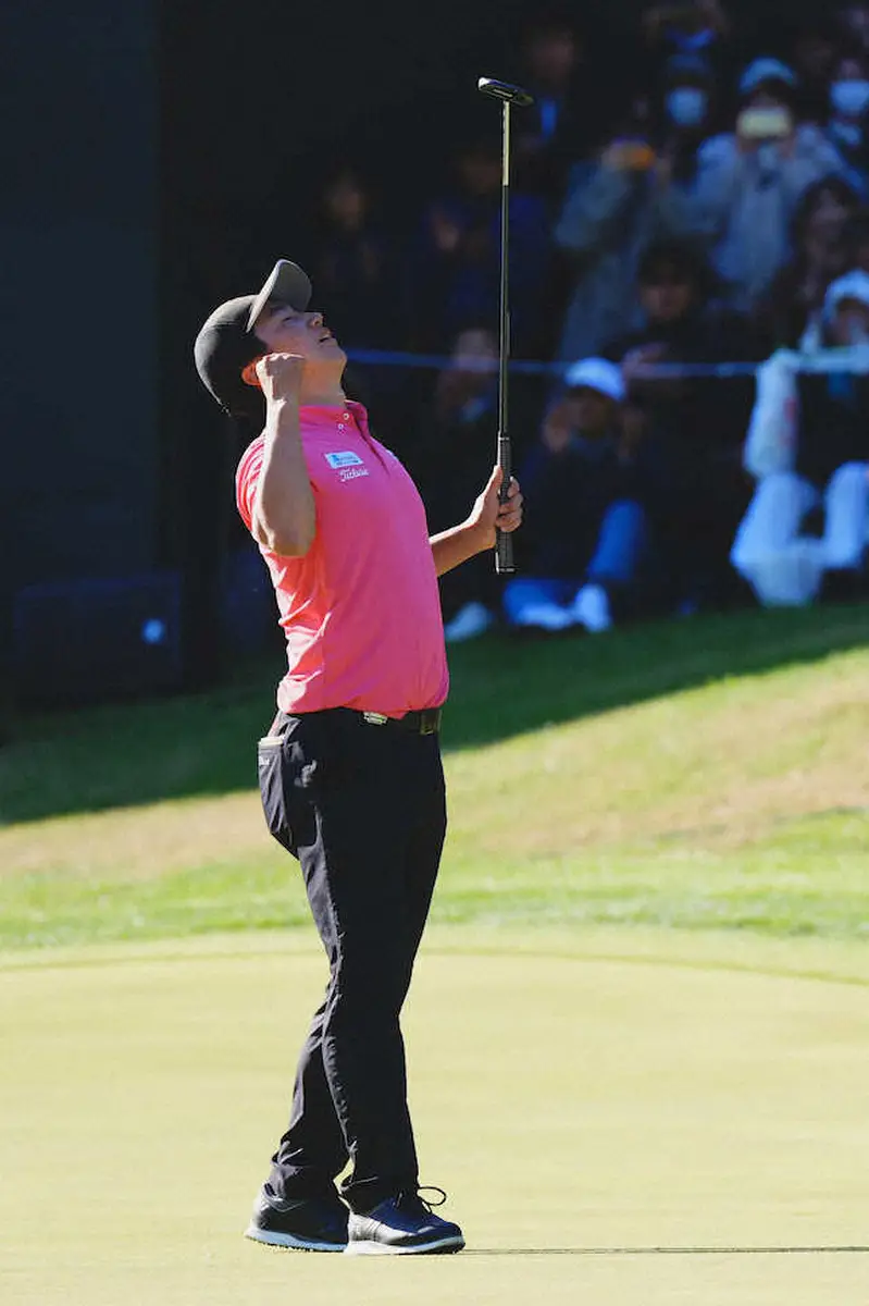 13番をパーでしのぎ迎えた14番。「僕の中では一番、狭いホール。でも1Wを持たないといけない。自分を信じた」。きっちりフェアウエーに置いてパーを取り、終盤の2つのバーディーにつなげた。ここ一番で出た曲がらない一打は高校時代から折り紙付きだ。17年に石川遼が開催したジュニアの大会で優勝。石川は「当時高1で初めて会ったが、本当に曲がらない選手。今はそのまま飛距離が出ている感じ」と話す。同組の中島は「テンポ良く淡々とプレーする」と評すように表には動揺を見せない強い心が他に追い上げを許さなかった。