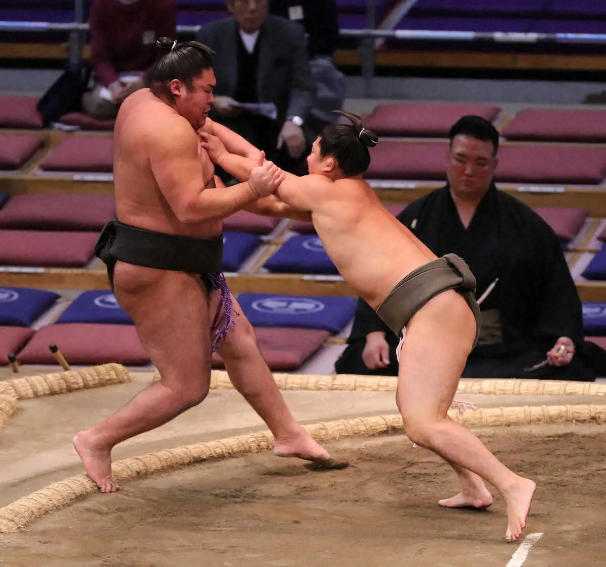 胸から当たって突っ張って先手を取り、相手の右腕を手繰って崩してからさらにもろ手で突いて押し出し。身長1メートル73、体重95キロの小兵ながら、正面から激しく攻めて40キロ以上重い相手に快勝。「今年最後の締めくくりなので悔いが残らないように」と攻めの姿勢に徹した。