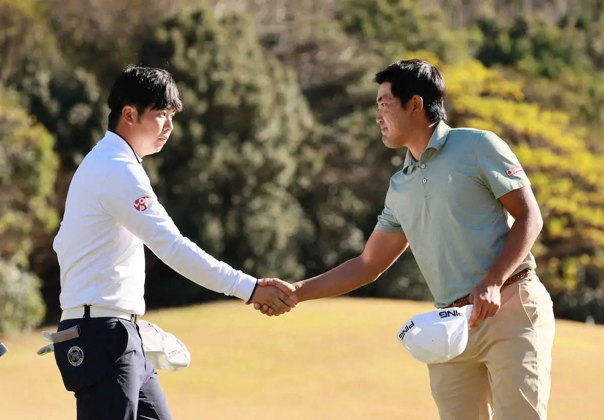 18番、首位タイに立った細野勇策(左)と金谷拓実はホールアウトしガッチリ握手(撮影・井垣 忠夫)