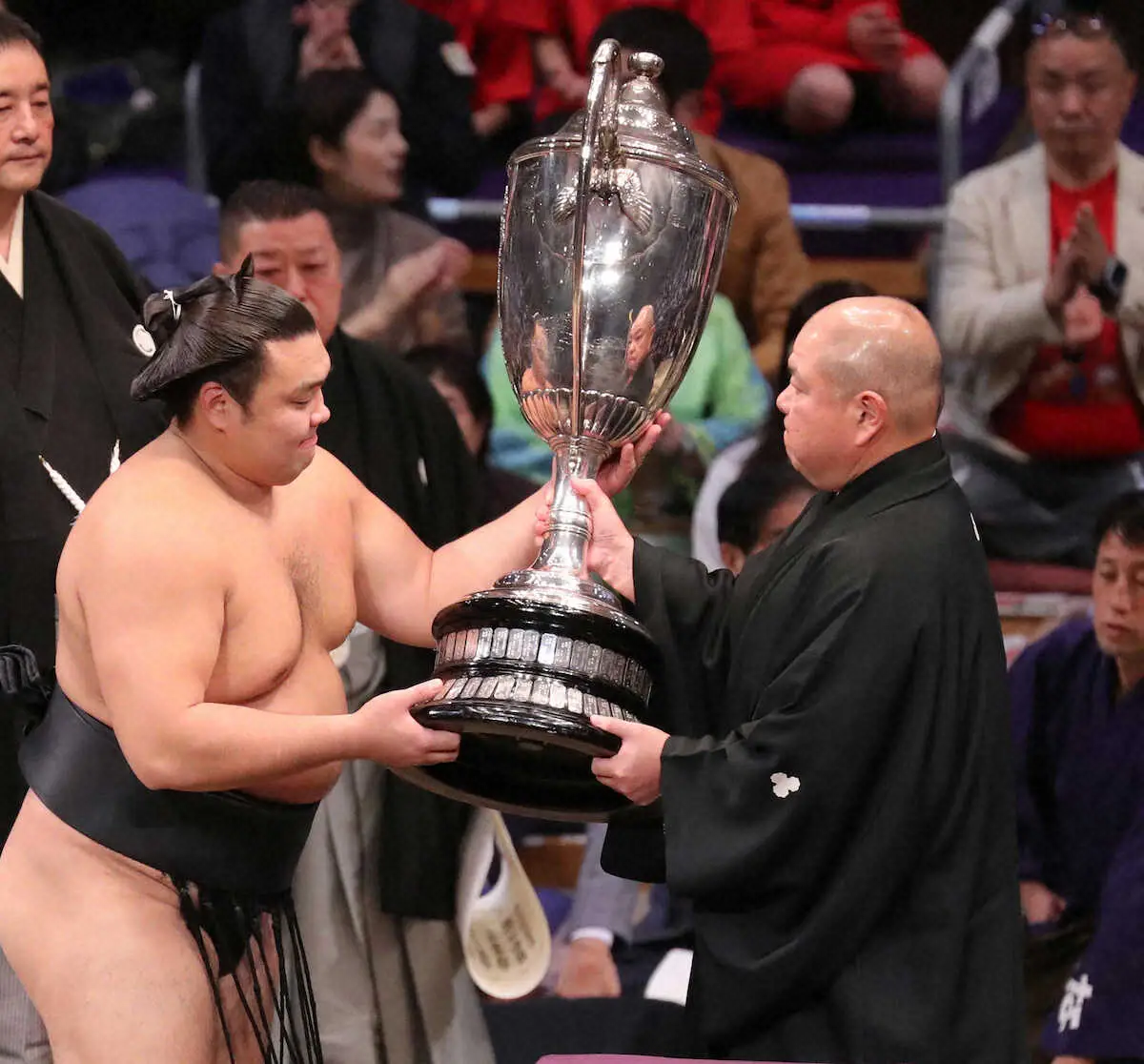 結びの一番で冷静に貴景勝を突き落とし、自身初となる13勝目を挙げ2度目の賜杯に花を添えた。優勝力士インタビューで霧島は、すっきりした表情を見せながら「うれしいです。(若い力士には)絶対負けないという気持ちで自信を持って」と喜びを語った。最多勝に輝いた一年だが、ケガにも苦しんだ。23年を振り返り「(ケガと闘っている時期は)よくなかったけど、今は素晴らしい1年」とはにかんだ。