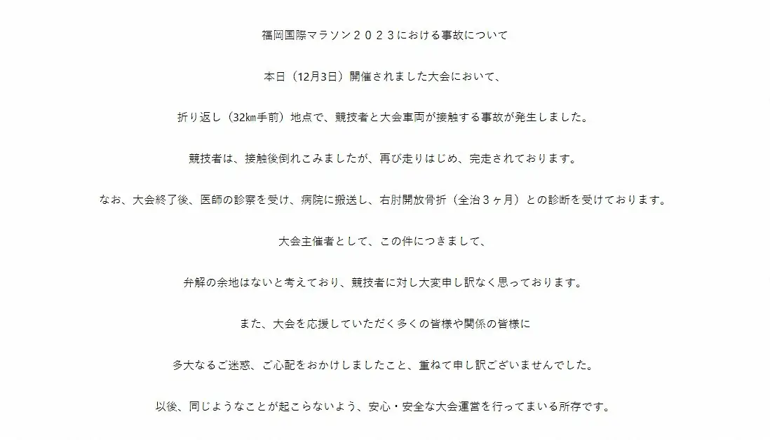 昨年の福岡国際マラソンのスタート(22年12月撮影) 福岡国際マラソンで重大事故 大会車両がランナーと接触 完走も「右肘開… ギャラリーで見る この記事のフォト 2023年12月03日の画像一覧 もっと見る 2023年12月03日の画像をもっと見る