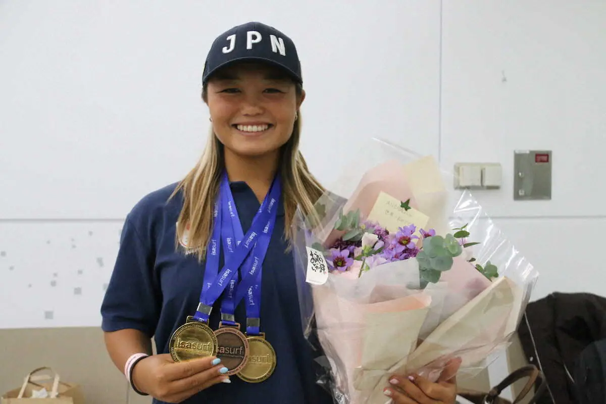サーフィン世界ジュニア選手権で女子18歳以下の部を日本人として初制覇した松岡亜音(あのん、18)が開催地のリオデジャネイロから成田空港に帰国。「凄くうれしい。中2で初めて出た時から先輩方の活躍を見ていたので(日本人初優勝は)凄く光栄」と笑顔で振り返った。