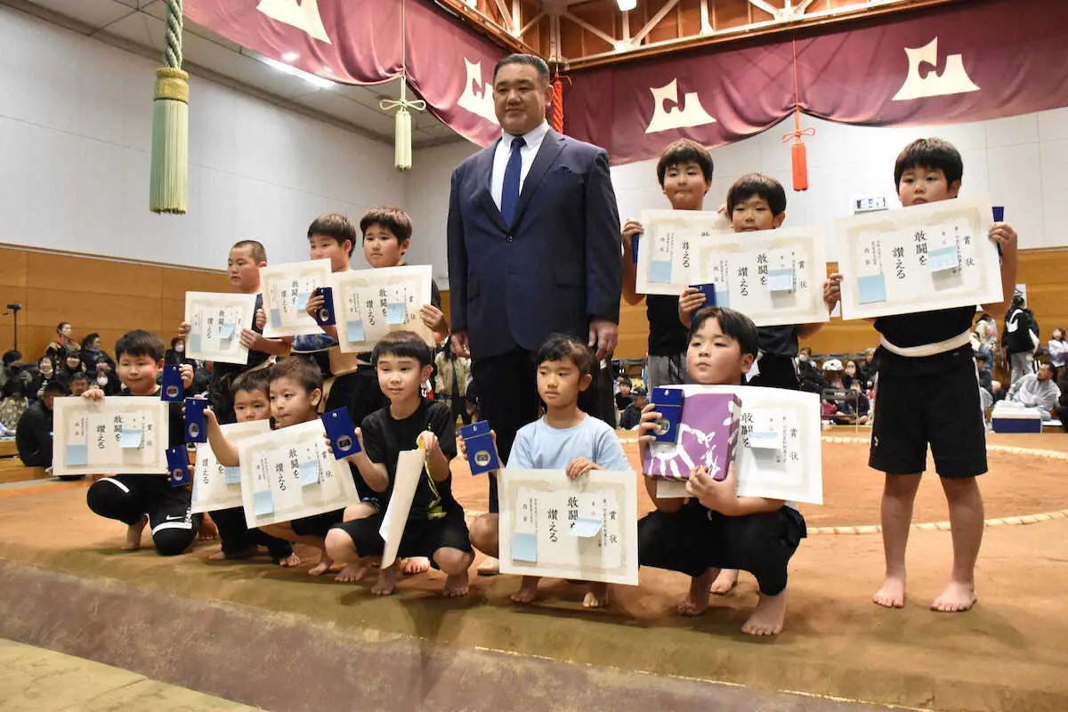 今回は西岩親方が「メインイベント」と期待する未経験者の枠も設置。まわしを締めずにTシャツ、短パン姿の園児、小、中学生らが初めて「相撲」に触れた。少子化などもあり今年の大相撲の新弟子検査合格者は史上最低の53人。相撲王国・青森も現役力士10人と寂しい状況だだが、西岩親方も「若い力は感じました。青森の未来は明るい。継続することが大事。相撲に触れるきっかけになれば」と感想を述べた。この日は「若の里」チームからは親方の長女・古川花さんが未経験者小学1年の部に出場。準決勝、決勝は男子選手との大熱戦を制して見事に優勝。花さんは本部席の父からねぎらいの言葉をかけられると緊張から解放されたのか大粒の涙がとまなかった。周囲の祝福を受けた西岩親方は「(優勝は)驚きました」と目を細めていた。