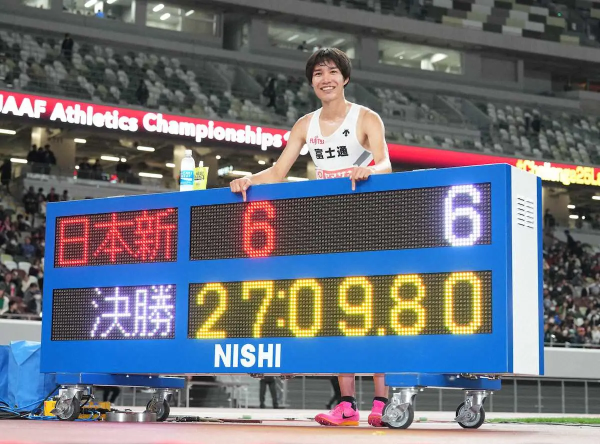 陸上の日本選手権1万メートルは10日、来夏のパリ五輪の代表選考会を兼ねて東京・国立競技場で行われ、男子は8月の世界選手権5000メートル代表の塩尻和也(27=富士通)が27分9秒80の日本新記録で初優勝した。