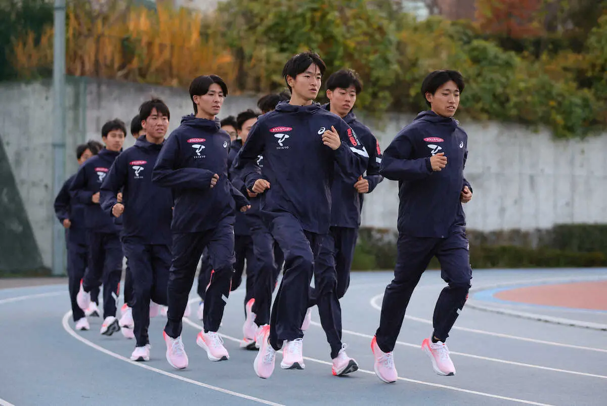 <箱根取材会・帝京大>笑顔でポーズする(前列左から)広田陸、島田晃希、尾崎仁哉、福田翔、小林大晟、日高拓夢、西脇翔太、小野隆一朗(後列左から)大西柊太朗、柴戸遼太、山中博生、高島大空、岩本拓真、針谷咲輝、末次海斗、大吉優亮 (撮影・白鳥 佳樹) Photo by スポニチ 【箱根駅伝】コロナ感染も脱水も乗り越えシード獲りへ帝京大・西脇主将「… ギャラリーで見る この記事のフォト 2023年12月14日の画像一覧 もっと見る 2023年12月14日の画像をもっと見る