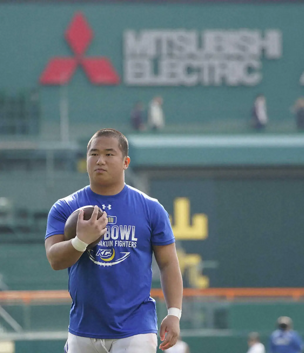 学生アメリカンフットボールの日本一を決める「第78回甲子園ボウル」で法大(関東代表)と対戦する関学大(関西代表)が14日、決戦の地で公開練習。史上初の6連覇へ、フィニッシャーとしての役割を期待されるRB大槻直人(4年)が目尻を思いっきり下げた。