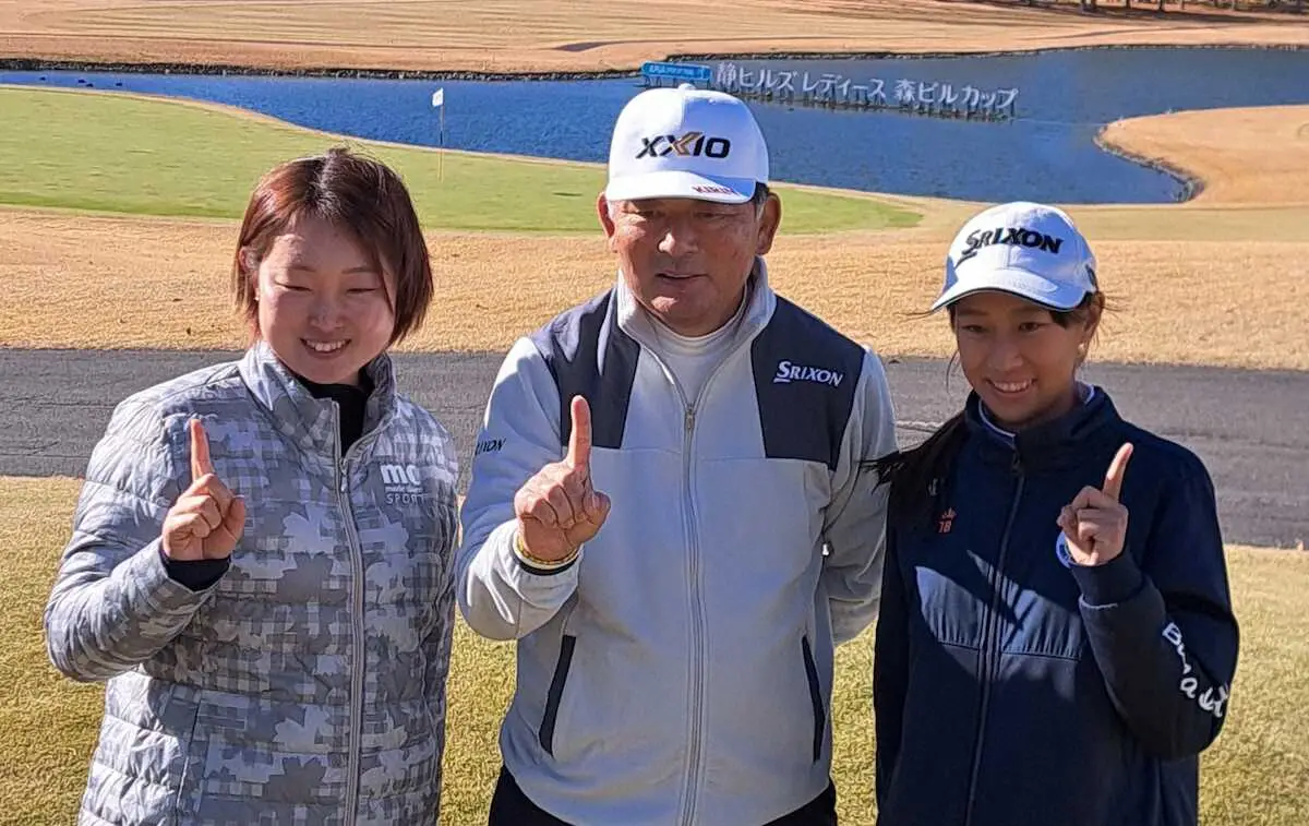 ヒルズゴルフ・トミーアカデミーに参加した小滝水音(左)と中嶋常幸、上久保実咲