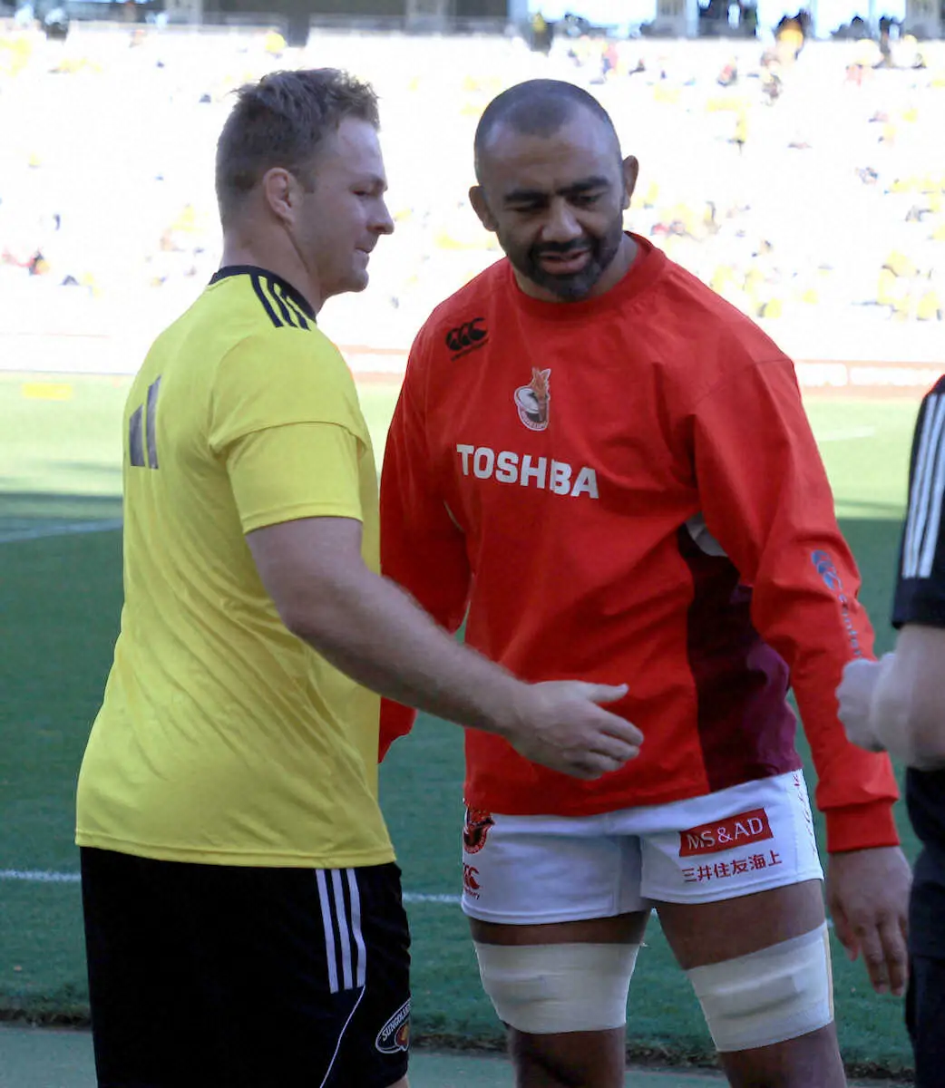 試合1時間前には両チームによるコイントスが行われ、東京SGのゲーム主将を務めるNo・8サム・ケイン(31)、BL東京のNo・8リーチ・マイケル主将(35)がグラウンドに登場。スーパーラグビーのチーフス時代に同僚だった2人は、がらがっちり握手し、言葉を交わした。コイントスの結果はケインが勝利し、ボールを選択。試合では対面として激突する。