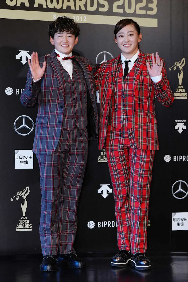 日本女子プロゴルフ協会表彰式「JLPGAアワード2023」が20日、都内で行われ、岩井明愛、千怜(ともに21=Honda)のツインズは色違いのおそろいのチェックのパンツスーツ姿で参加した。明愛がグレー、千怜が赤が基調の衣装で、この日のために購入したかと思いきや、「レンタルです」と明かし、笑いを誘った。2人で優勝を争った5月のRKB×三井松島レディースのプレーオフで2人は2打目で“直ドラ”を選択。これがメディア賞「ベストショット部門」として表彰を受けた。
