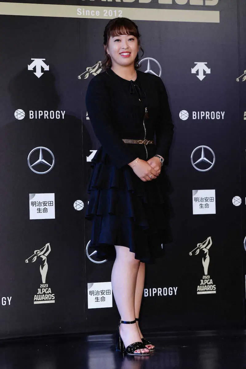 【JLPGAアワード2023】西郷真央 黒の膝丈のワンピースに、ルイ・ヴィトンのベルトがアクセント