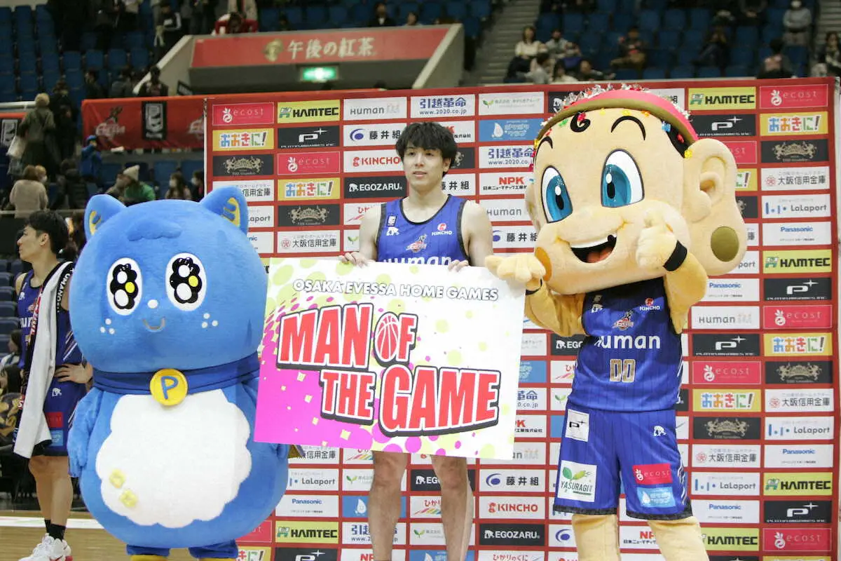 マン・オブ・ザ・ゲームに選ばれた大阪エヴェッサ・橋本が記念撮影