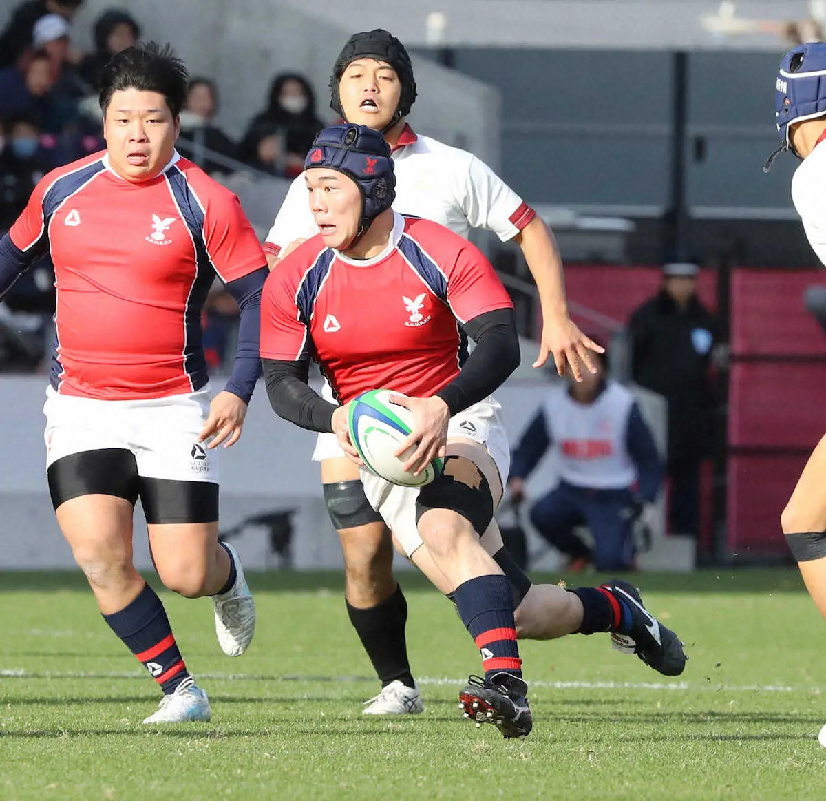 前半5分、FB辻野隼大(3年)のペナルティーゴールで先制。同10分に逆転を許したが、6―7の同22分にNo・8シオネ・ポルテレ(2年)が相手のタックルをものともしない中央突破で再逆転すると、そこからは一度もリードを許さず30点以上の差をつけて圧倒した。