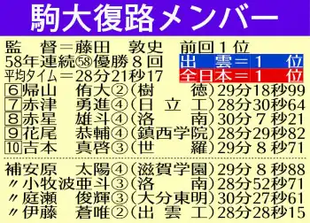 駒大復路メンバー Photo by スポニチ 【箱根駅伝】2位駒大 青学大は射程圏 藤田監督2季連続3冠へ復路に「力の… ギャラリーで見る この記事のフォト 2024年01月03日の画像一覧 もっと見る 2024年01月03日の画像をもっと見る
