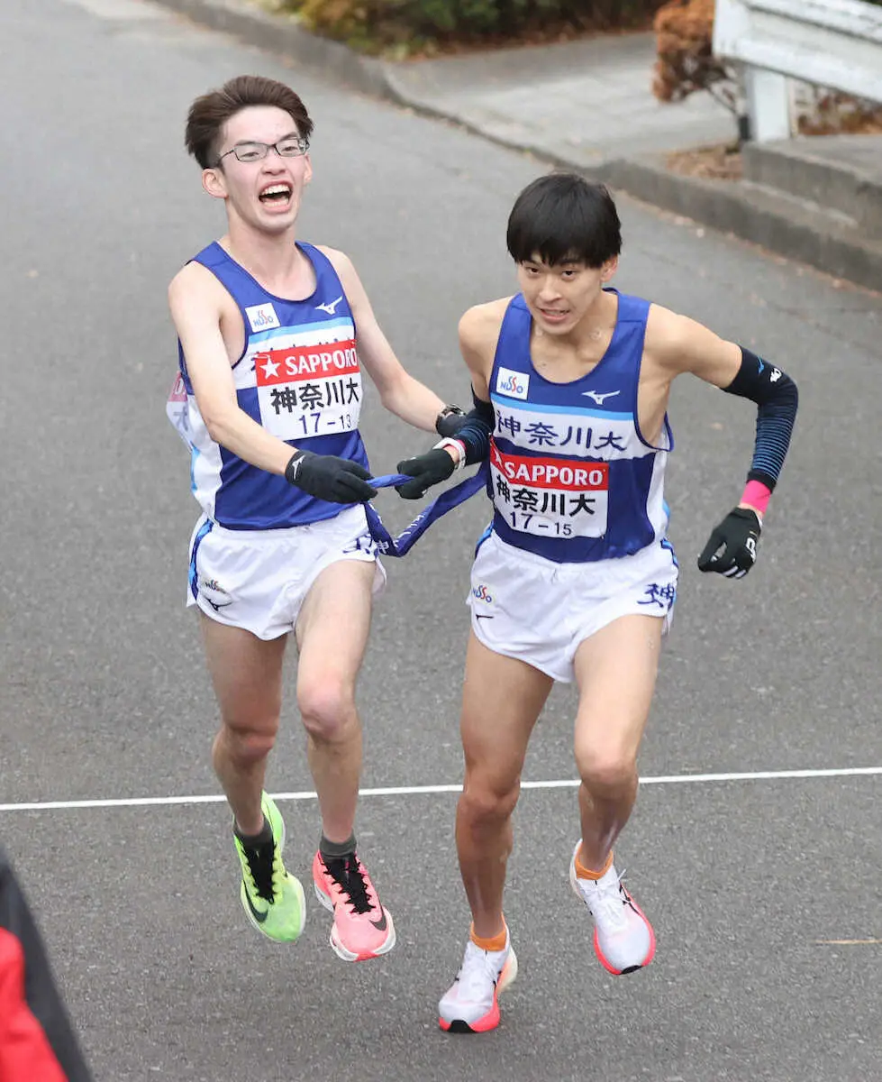 神奈川大9区・佐々木(左)からたすきをつなぐ10区・酒井(撮影・村上 大輔)