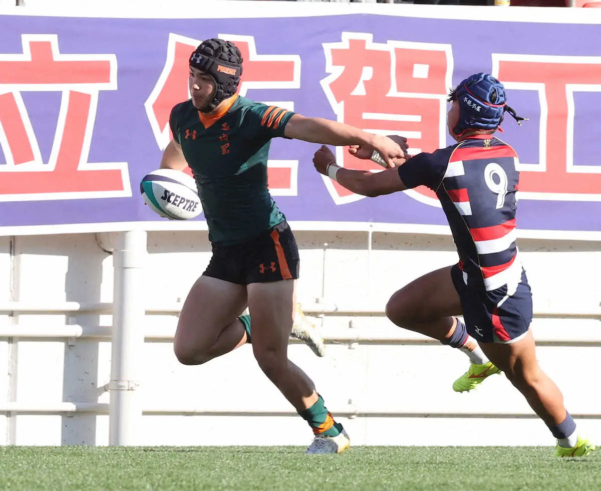 東福岡が準決勝で初めて実現した九州対決を制した。5―3の前半11分にDGを許し、今大会で初めてリードされた直後の攻撃。同12分、右サイドで鮮やかにパスをつなぐと、高校日本代表候補のCTB神が逆転トライを奪った。「外側の防御が弱いのは分かっていた。ミスをしない攻撃をすれば、必然的にトライは取れる。素早く取り返せたのは、チーム的にも自分的にも良かった」と喜んだ。