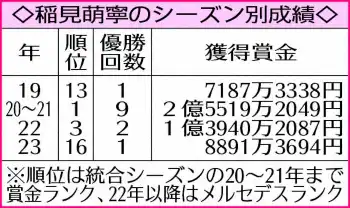 稲見萌寧のシーズン別成績 Photo by スポニチ 稲見萌寧 松山英樹からの“追い風”受けて戦う!「凄くワクワク」 参戦1年… ギャラリーで見る この記事のフォト 2024年01月17日の画像一覧 もっと見る 2024年01月17日の画像をもっと見る