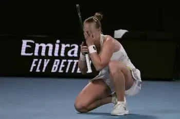 女子4大大会史上最長となるタイブレーク22-20。激闘を制したブリンコワは涙のあふれる目を両手で覆い、その場に崩れ落ちた。