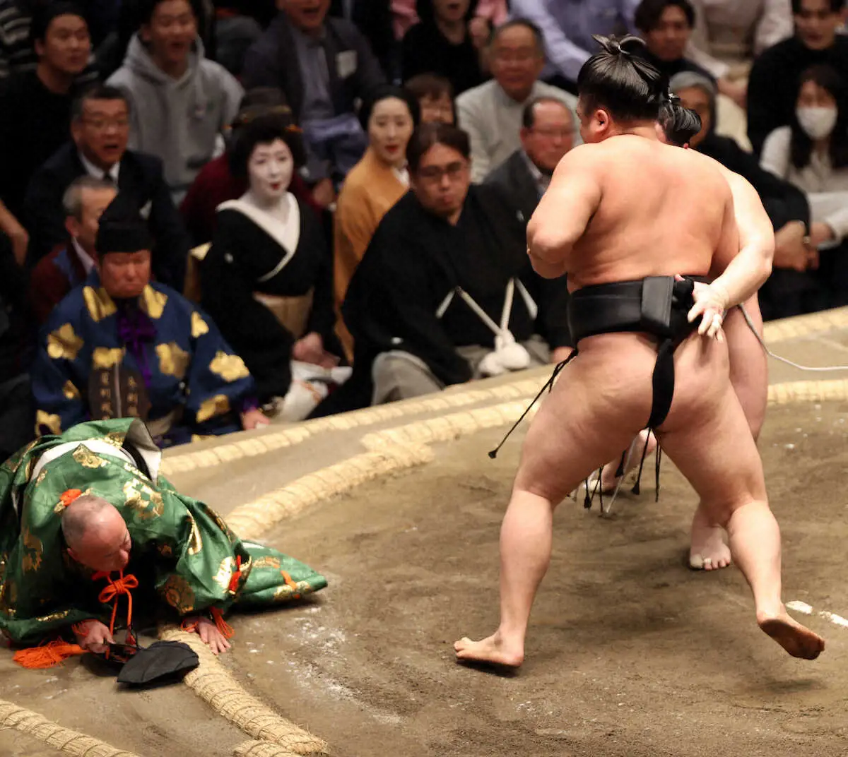 激しい攻防のなか行司の木村容堂がバランスを崩して転倒。しかも烏帽子(えぼし)と草履が脱げるアクシデントが発生したが「当たった感じはあった。でも落ち着いて取れて良かった」と冷静に対処した。