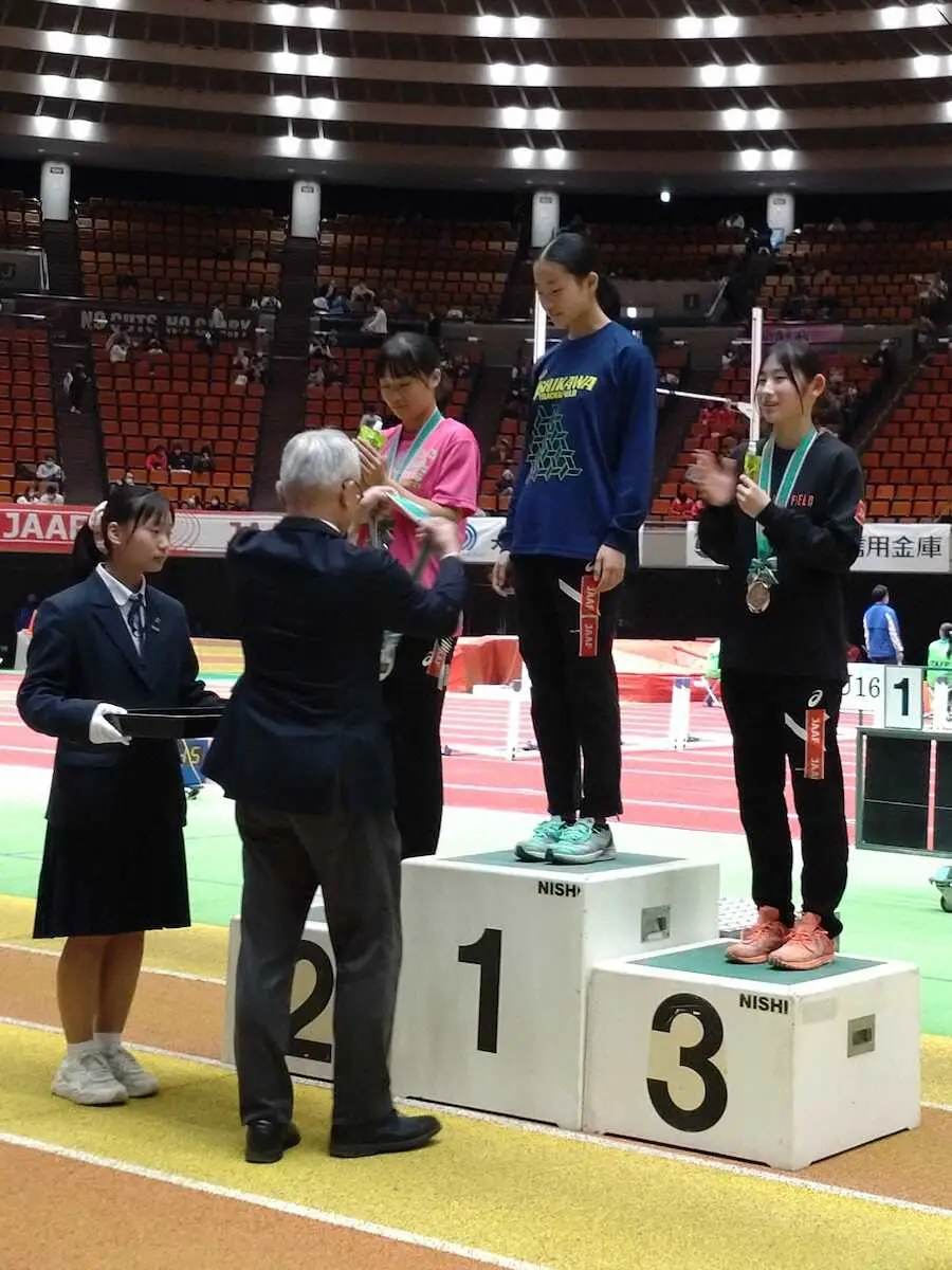 大会記録の5メートル84で優勝した石川・津幡中2年の藤本茉優(中央)