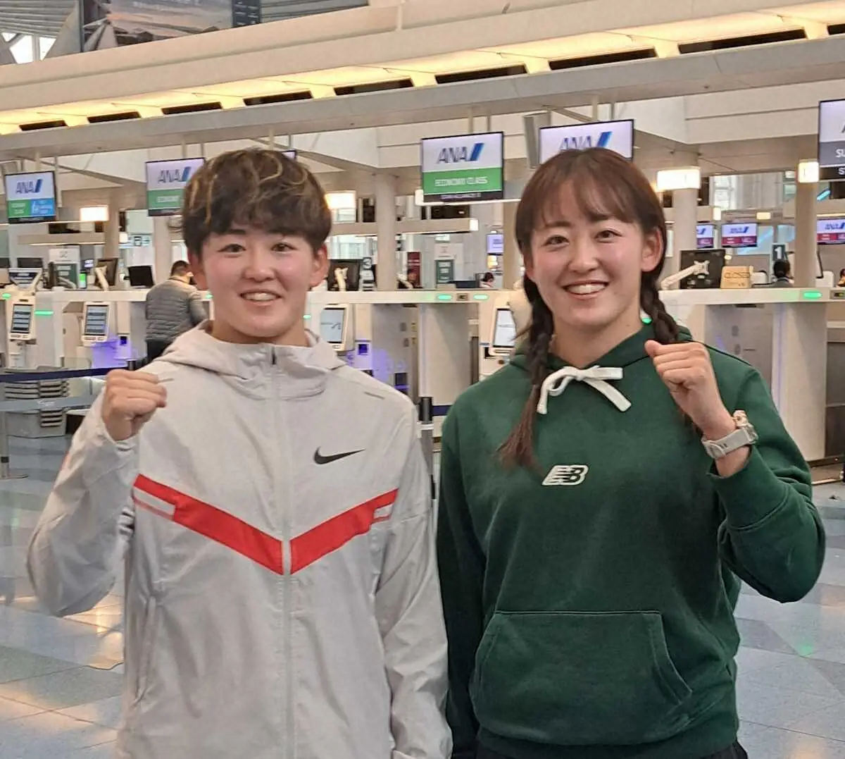 タイ合宿に向けて羽田空港を出発した岩井明愛(左)、千怜姉妹