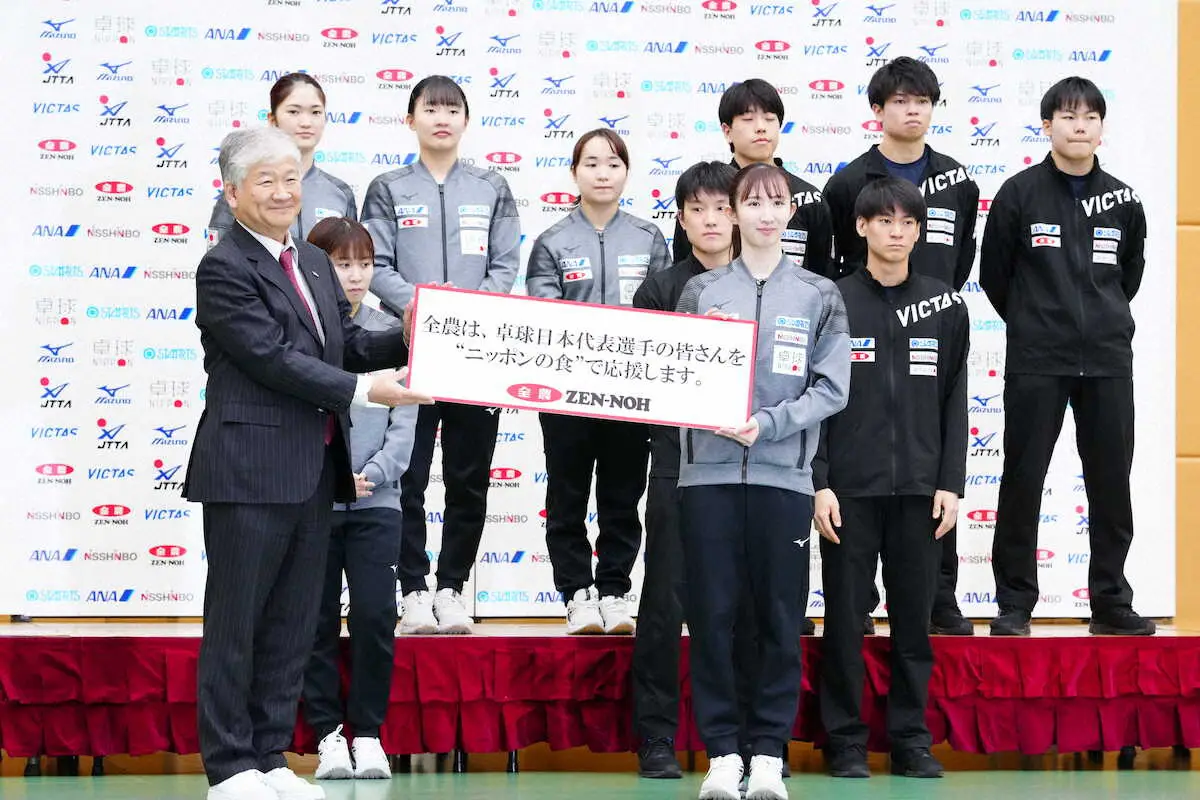 世界卓球団体戦に出場する総勢10選手は8日、卓球日本代表オフィシャルスポンサーの全国農業協同組合連合会(全農)から豪華な国産食材を贈呈された。
