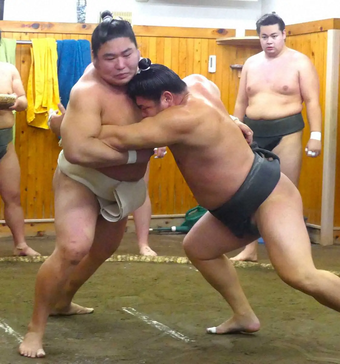 申し合いでは、幕下・大賀(21)、三段目・丹治(17)、若隆元(32)の3人を相手に11番。稽古をつけながらも、自身が得意とする左四つからの厳しい攻めも見せた。