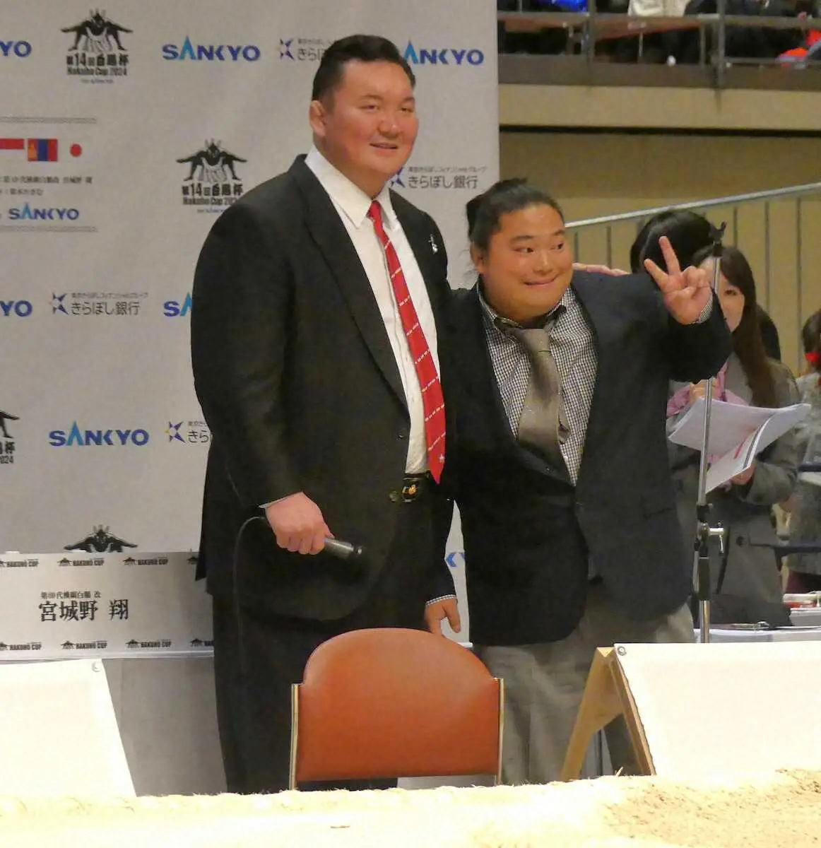 今大会に特別ゲストとして、伊勢ケ浜部屋の元幕下力士で現在タレントとして活躍する富栄ドラム(31)が来場した。宮城野親方とは同じ伊勢ケ浜一門で稽古をつけてもらった間柄。同親方からのオファーに応え、中学生個人戦決勝トーナメントの副審や、表彰式のプレゼンター役を務めた。