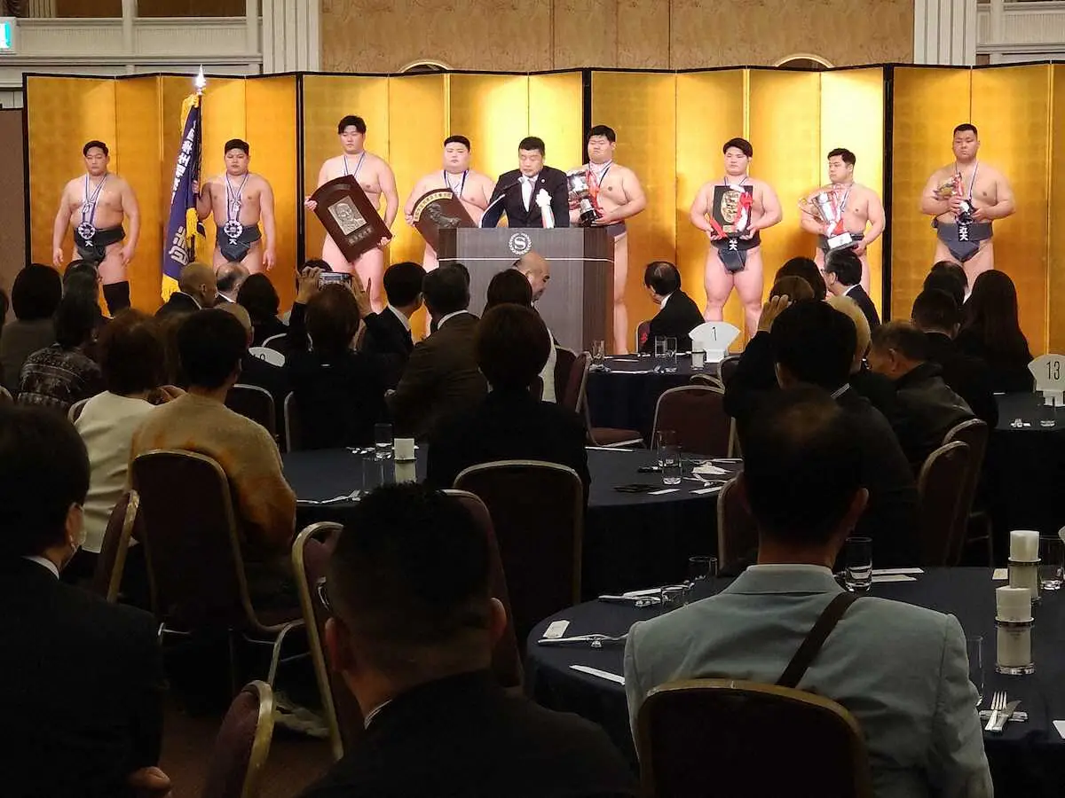 昨年11月、堺市での第101回全国学生相撲選手権大会の団体戦で13年ぶり9度目の優勝を果たした近大相撲部の祝賀会が18日、大阪市内のホテルで開かれ、来年度の新主将に、OBの平幕・朝乃山(29)の富山商高時代の恩師、故浦山英樹氏の長男・浦山秀誠(3年)が選ばれたことが分かった。