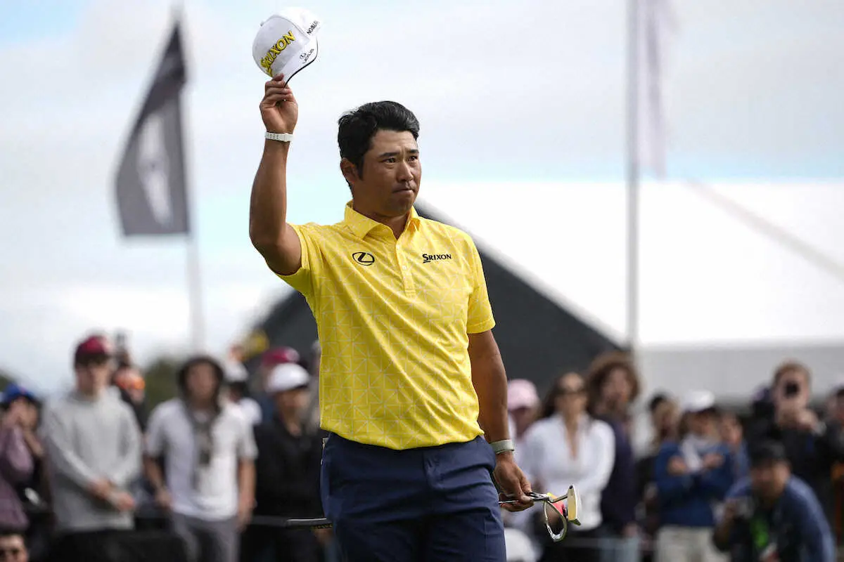 18番グリーン、観客の声援に応える松山英樹(AP)
