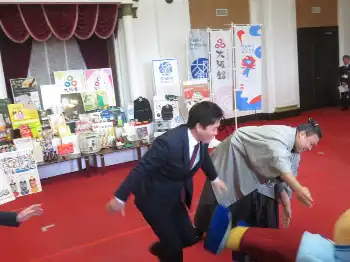 贈呈式後は現役最古の有形文化財である5階正庁の間で、広報担当副知事であるゆるキャラ「もずやん」と相撲を取った。