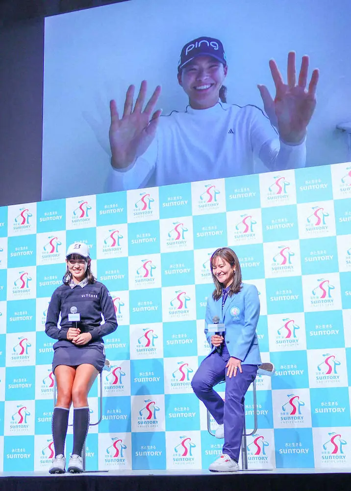 <馬場咲希所属契約記者発表会>渋野からのビデオメッセージに笑顔の馬場(左)、宮里藍氏(撮影・光山 貴大)