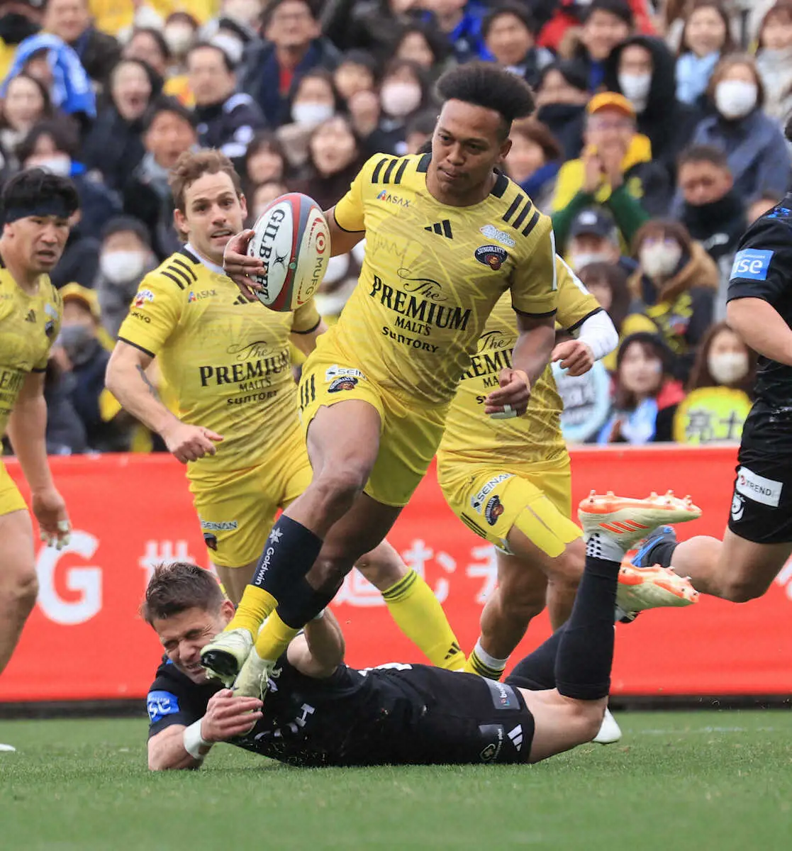 前節の埼玉戦では先発を外れていた松島は前半16分、ゴール正面でラストパスをもらい1トライ目。後半には自陣中盤から見事な50:22キックを決めて陣地を回復すると、最大の見せ場は同27分。公式戦デビューとなったアルゼンチン代表SOサンチェスからパスを受けると、約30メートルをステップを切りながら突破。最後は相手フランカーのタックルを振り切って2トライ目を挙げた。
