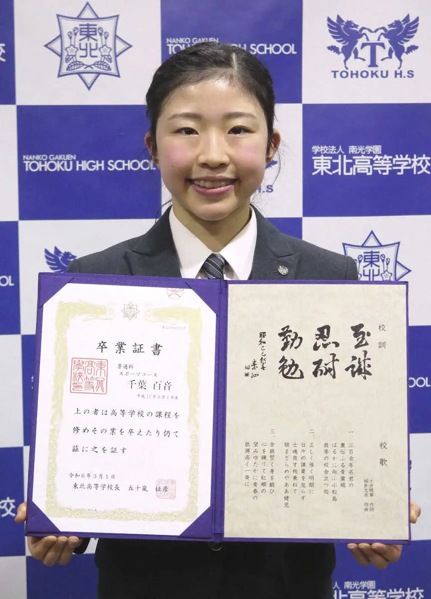 フィギュアスケート女子で2月の四大陸選手権を初制覇した千葉百音(木下アカデミー)が1日、仙台市内で東北高の卒業式に出席し、4月から早大人間科学部の通信教育課程に進学すると明らかにした。