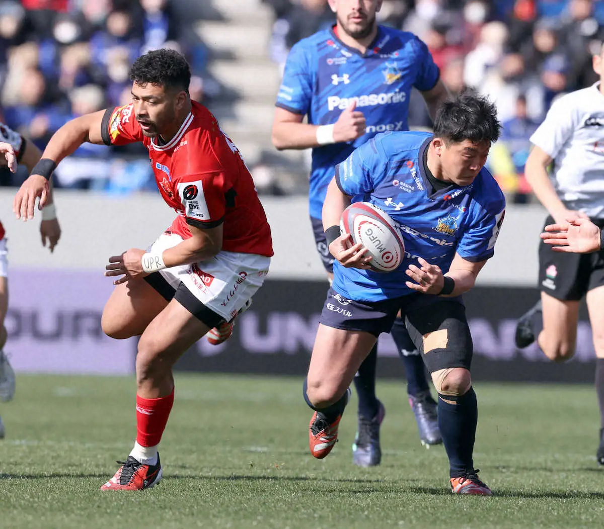 <埼玉・BL東京>前半、BL東京・モウンガ(右)のタックルをかわし突進する埼玉・坂手(撮影・久冨木 修)